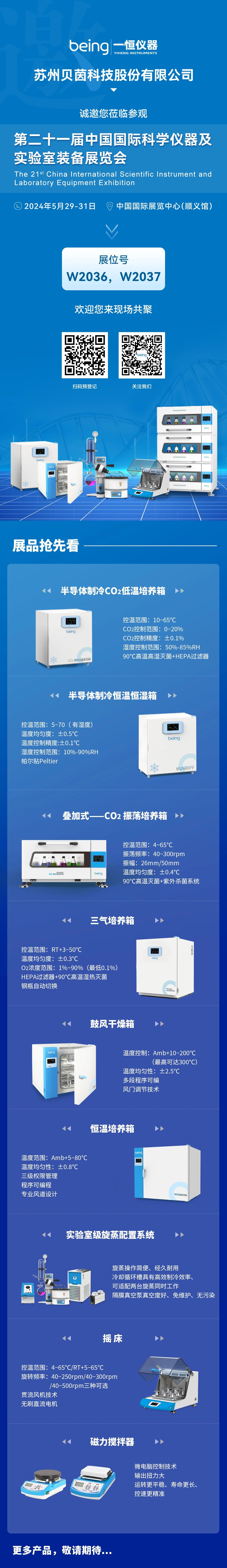2024-05-21 | 文章(zhāng)來源: | 點擊率: 第二十一屆中國國際科學(xué)儀器及實驗室裝備(bèi)展覽會(CISILE 2024)定於2024年5月29—31日在中國國際展覽中心(順義館)舉辦。中國國際(jì)科學儀器(qì)及實驗室裝備展覽會(CISILE)已成為了解實驗室科學儀(yí)器的重要窗口、匯聚產業資源要素的重要平台。貝茵科技本次將攜半導體製(zhì)冷二(èr)氧(yǎng)化碳低溫培養箱(xiāng)、半導體製冷恒溫恒濕箱、鼓風幹燥(zào)箱、恒溫培(péi)養箱、三氣培養(yǎng)箱、疊加式-振蕩培養箱、旋轉蒸發儀、磁力攪拌器、粘(zhān)度計等產品亮(liàng)相展位(wèi):W2036,W2037,現場展(zhǎn)示智(zhì)能、高效與環(huán)保的產品,期待您蒞臨現(xiàn)場,交流合作。