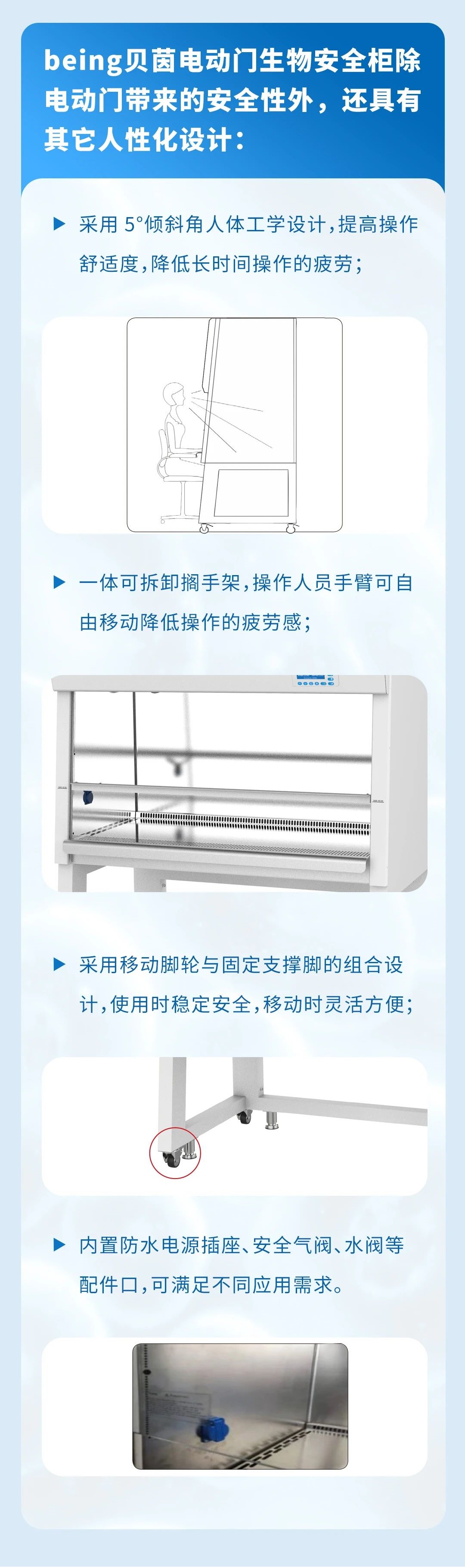 being貝(bèi)茵生物安(ān)全櫃可進行電動門升級,前窗玻璃門通過電動升降來進行準確控製,還可以配置腳踏開關,直接通(tōng)過腳踏開關來控製電動門的升降。being貝(bèi)茵電動門生物安全櫃可實現實驗過程中釋放操(cāo)作者雙手,有效提高實驗人員(yuán)工作效率,同時避免實驗過(guò)程中兩人不(bú)同(tóng)步可能帶來的生物(wù)安全隱患。