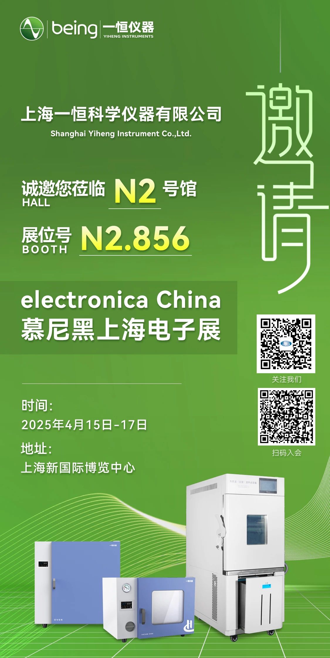 2025-04-08 | 文章來源: | 點擊率: 一恒儀(yí)器誠邀您參加將於4月15-17日在(zài)上海新國際博覽中心舉辦的2025慕尼黑上海電子展(zhǎn)。我們將在現場展示真空幹燥箱、鼓風幹燥箱、高低溫試驗箱等設備,展位(wèi)號:N2.856,一恒儀器願成為您理想的實驗室夥伴。